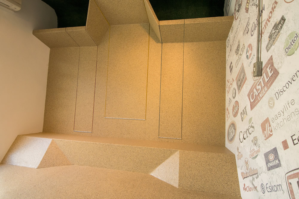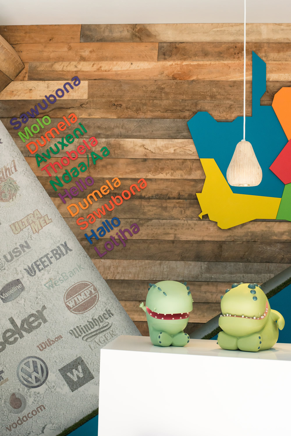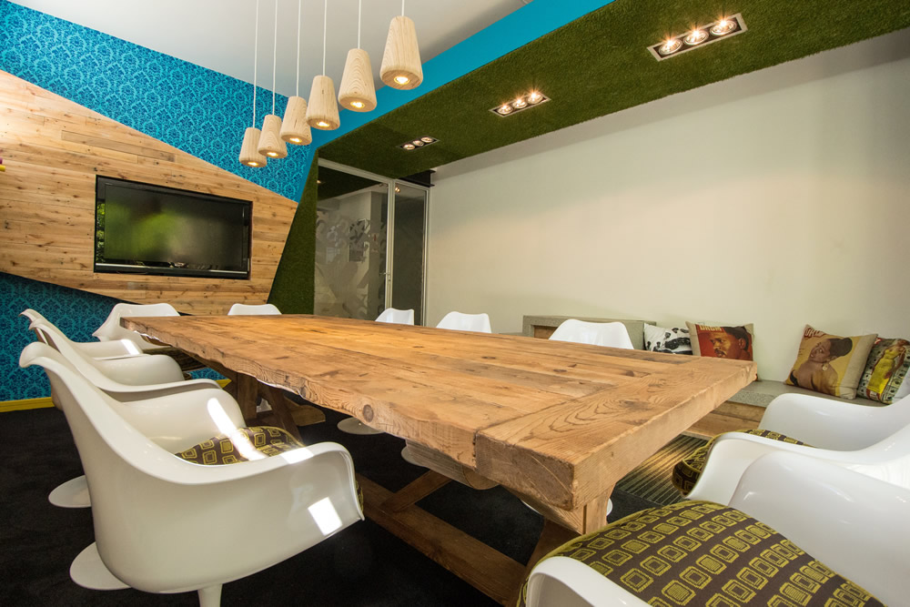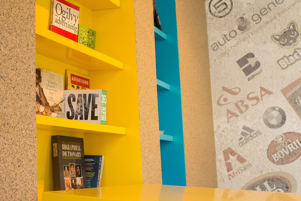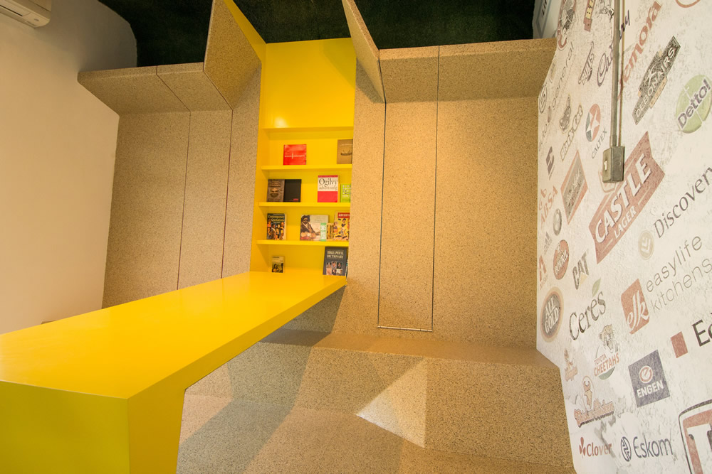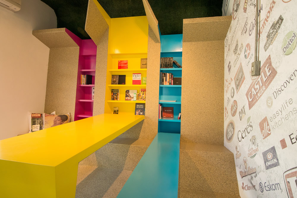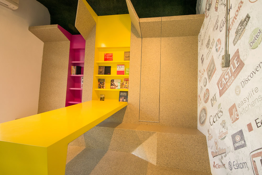 空间设计同时向建筑的殖民地根源致敬,将其与现代南非文化整合。来庆祝这个充满活力的彩虹国度。通过组合传统的欧洲元素,如锦缎图案的壁纸与传统的非洲纹理(木板条栅栏等)来实现。接待区显示全国的9个省市,同时采用11种南非官方语言表示问候。问候语的颜色与省市的颜色相对应。图书馆/小会议室的设计旨在创建一个多功能的空间,可以放松或者进行会议。同时其内部的桌子和凳子可以折叠起来。