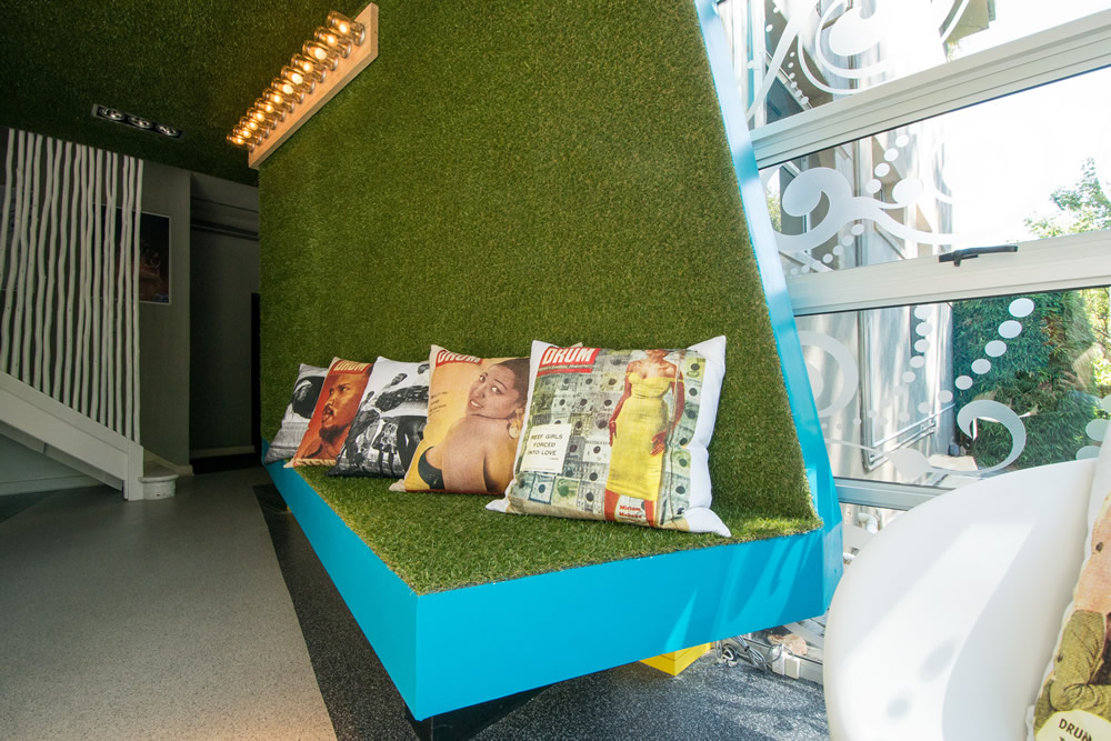 这是一栋古老的房子,现有的空间缺乏连贯性。建筑师的主要目标是开放这个空间,获取更多光线,创建出原本毫无关联的房间之间的动态对话。设计采用绿色人造草皮覆盖空间,其流经的区域连接起接待区及主会议室,并延伸成为等待区的坐席及一个客用卫生间的隐藏入口,实现了空间的连接。