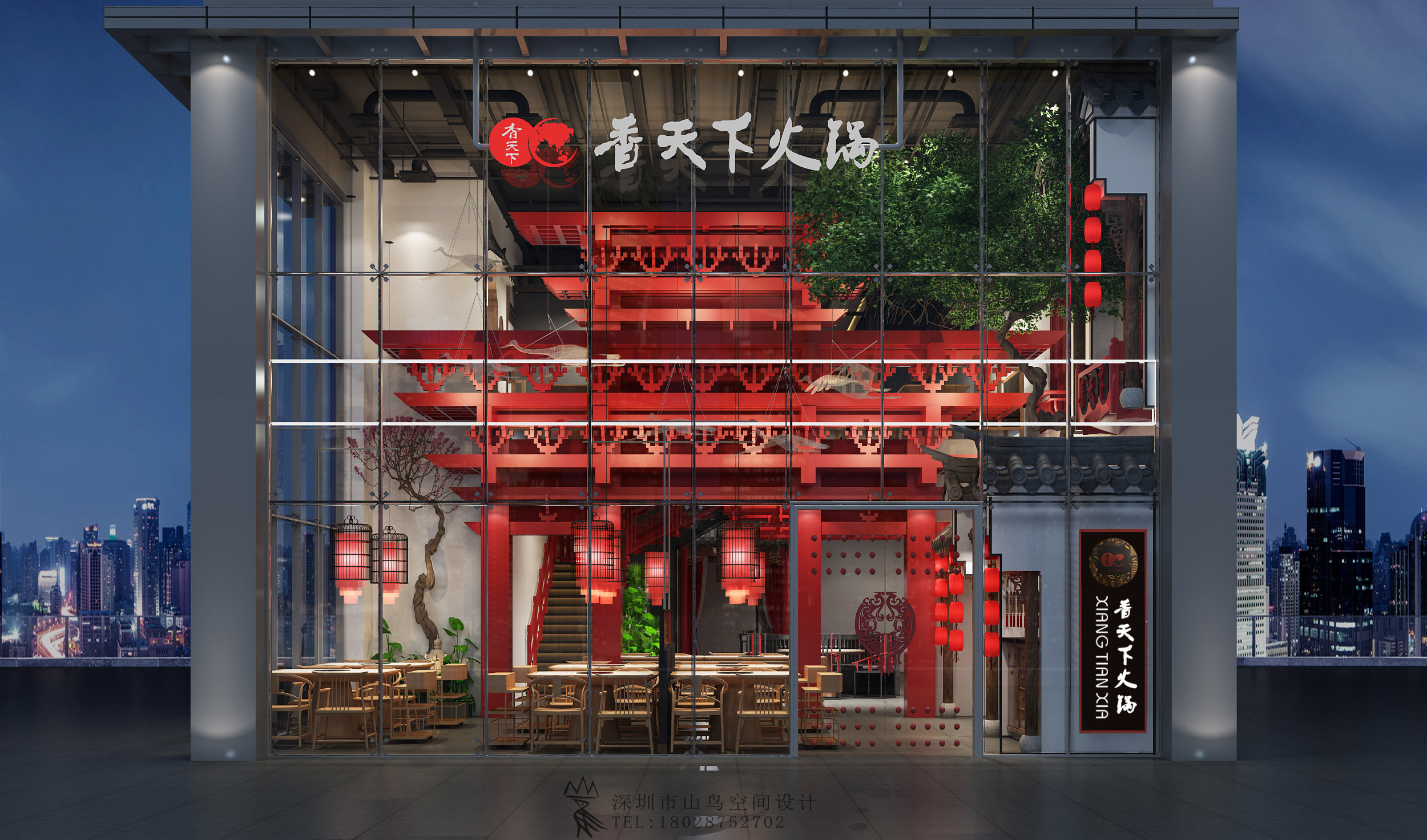 举一个最近做的项目案例:我一直有在做传统风格系列的作品,传统风格有很多的做法,最近比较喜欢这种大落地玻璃的感觉。我把它应用到我们项目设计当中,就没有再把传统的门头造型做在门头了。而是像高大上的服装店一样,让空间内部设计一览无余。这样既节约造价成本,餐厅内部的热闹气氛也将会感染到行人勾起食欲……商业空间设计的性价比一直是我研究的课题……我将会一直追寻下去……